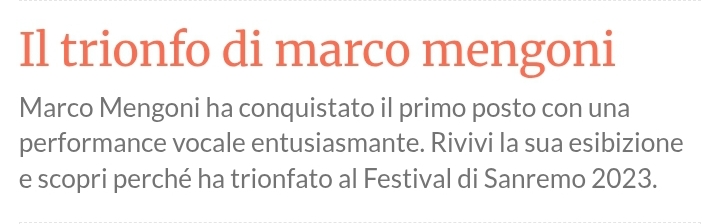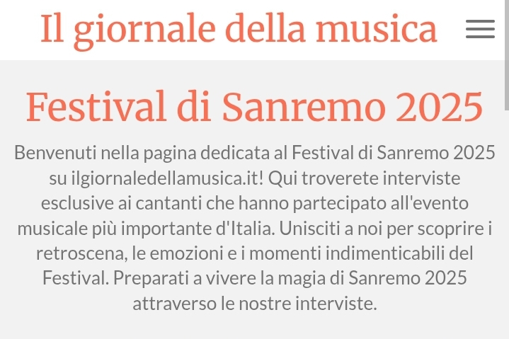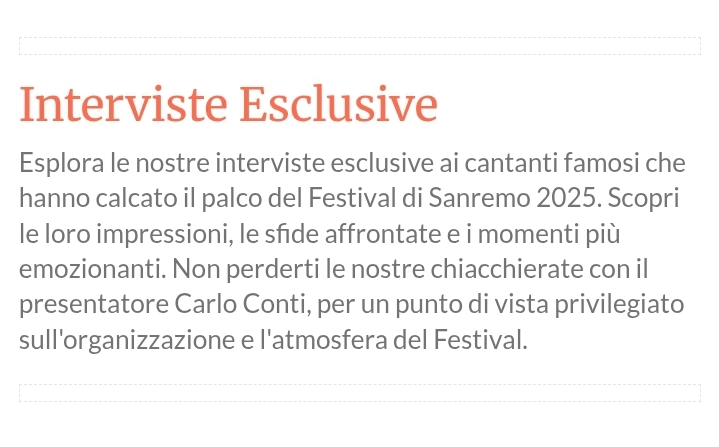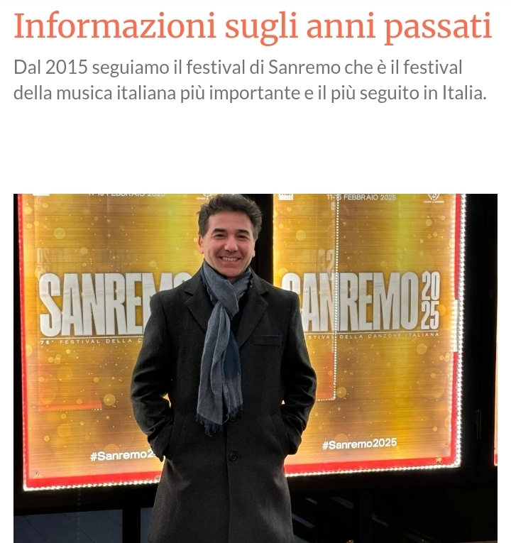 🎶 Sanremo 2025 (75ª edizione)📍 Quando e dove: Teatro Ariston, 11–15 febbraio 2025. 🎤 Direzione artistica e conduzione: Carlo Conti alla regia artistica (dopo l'era Amadeus). 🏆 Vincitore: Olly con "Balorda nostalgia". 🥈 Secondo: Lucio Corsi. 🥉 Terzo: Brunori.
