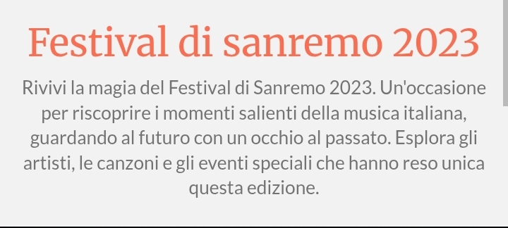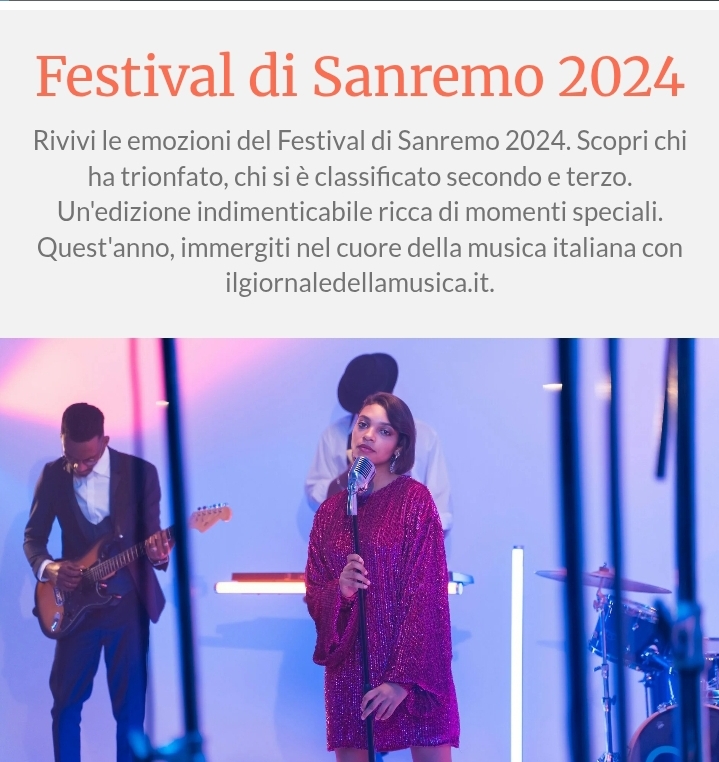 🎶 Sanremo 2024 (74ª edizione)📍 Quando e dove: Teatro Ariston, Sanremo, febbraio 2024. 👨🎤 Conduttore e direttore artistico: Amadeus — era la sua quinta e ultima conduzione consecutiva.